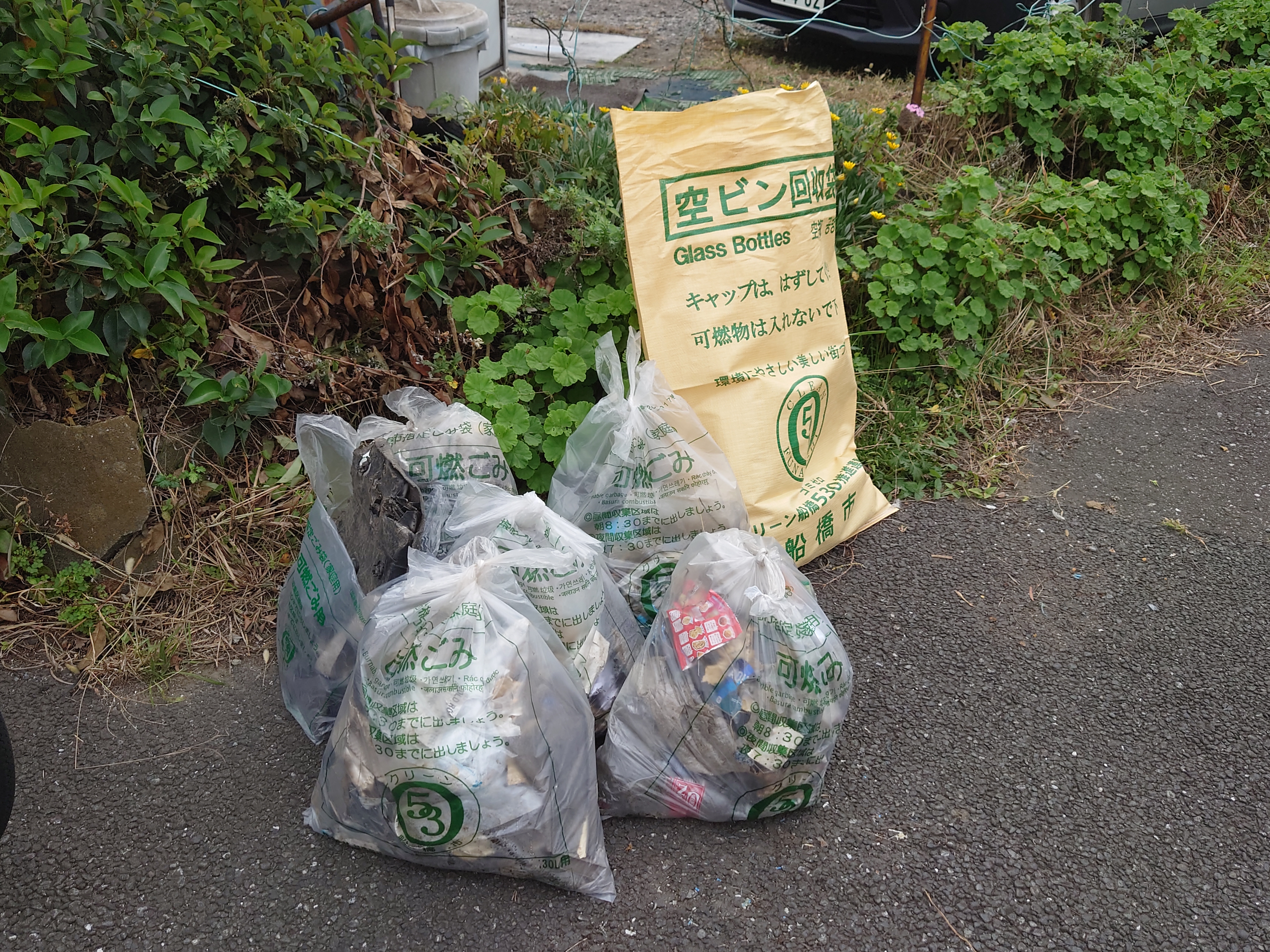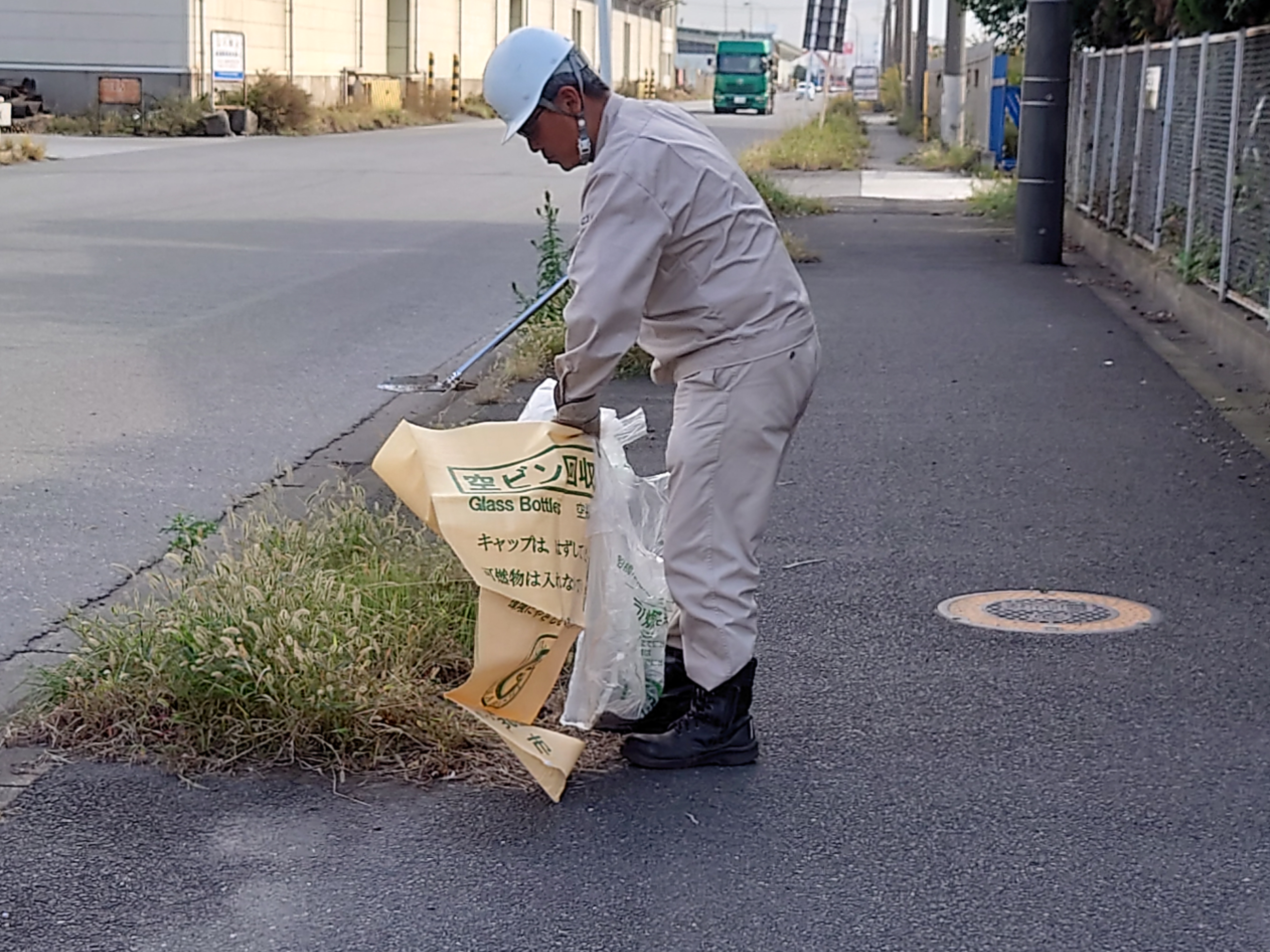 岸壁や置場で拾うごみは木くず類が中心でしたが、道路で拾うごみは紙片や飲食物の包装類が多い印象です。これらのごみを、道路脇の茂みの中から丁寧に拾い集めていきます。