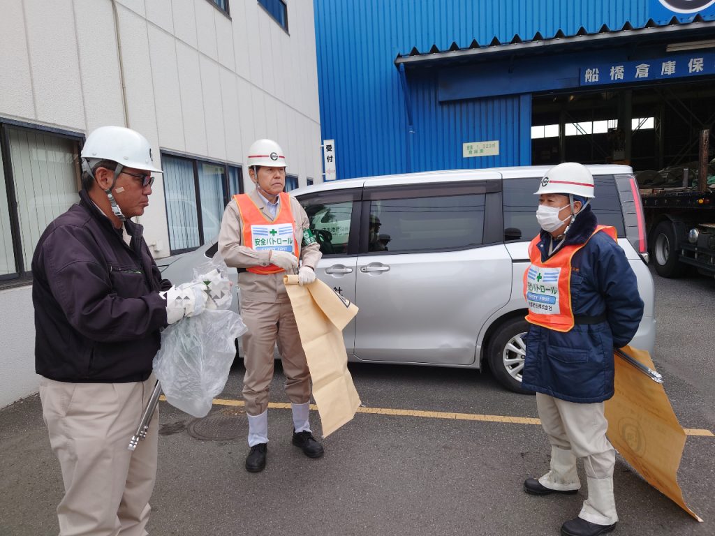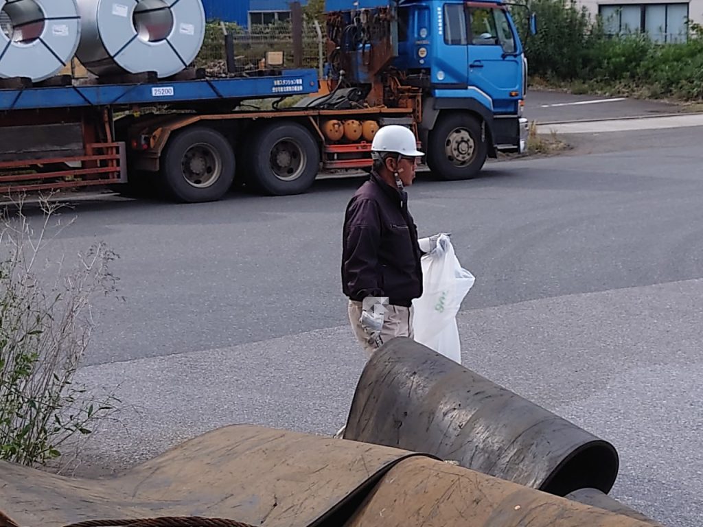 鋼材を積んだ大型車両が頻繁に行き交う中、安全に十分気を付けながらごみを拾っていきます。